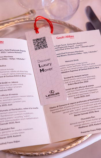 Kulinarske kreacije chefova bile su poslužene na tanjurima Duke grupe. Uz jelovnik na stolu uzvanike je čekao i QR kod za pristup stranici Lexus uz uvid u ekskluzivno LM